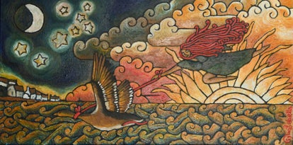 This particular work was begun a few weeks before my trip to Scotland. It was inspired by the song "Gooserider" by Scottish band Beluga Lagoon. The goose being symbolic of the divine, it carries the woman across the seas and into the unknown. The two are tethered to each other by a red ribbon, red being symbolic of life and luck. The ribbon is tied with a bow rather than a knot, signifying that both are on this journey not by force, but by choice, and as willing participants. Either one could, at any given time, release the bow that ties the two together. They are leaving the warmth of the sun behind them as it sets, and heading into the unknown; towards a sky full of the moon and the stars. In my paintings the moon represents the masculine principle rather than the feminine, so in effect the feminine is traveling to meet her masculine counterpart, signifying a union of the two. After beginning this painting, the symbol of the goose seemed to pop up everywhere I looked, both in Australia and throughout the duration of my short stay in Scotland, as if to be a constant reminder that I was not alone. Apart from being a Pictish symbol from antiquity, the month of September was also the start of goose migration season, which I found particularly fitting. The Pink Footed Geese, like me, are not a native to Scotland, but choose to find shelter in Scotland. This painting is a love story of a different kind. It is symbolic of the irrational, but very real love of a girl and her deep connection to Scotland, its land, its rivers, its hills and its seas.