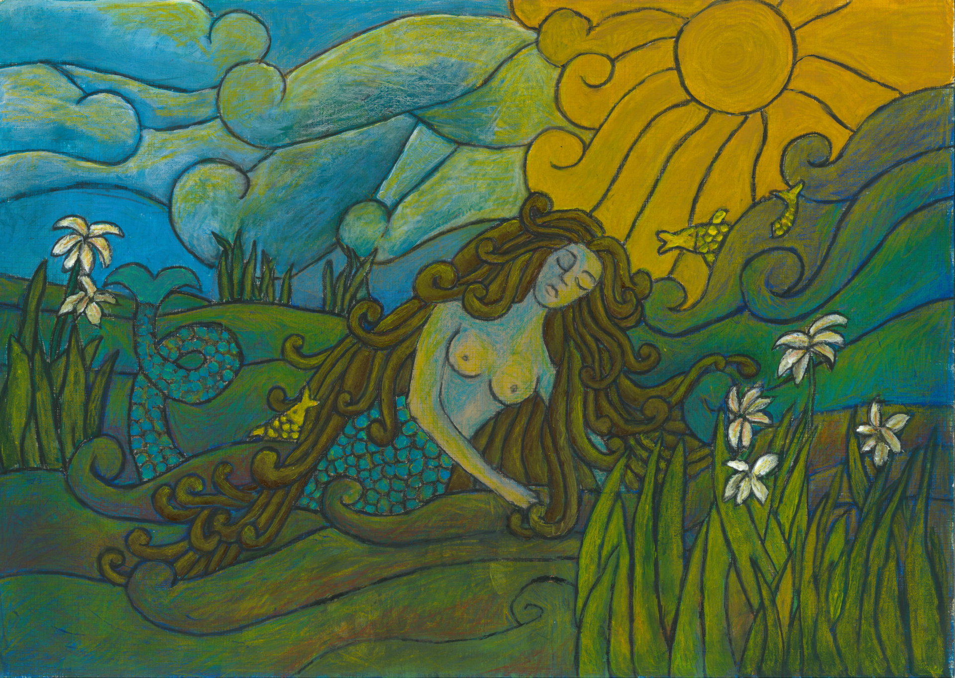 The re-imagined work shows the transition towards healing. The blood has been transformed into fiery red hair, an embodiment of her passion and strength. As she is being embraced by the water and forest around her, two cranes join her, one symbolically covering her, protecting what was previously taken from her and restoring respect for that which was taken for granted. It falls in unison with her to show her that she is not alone, the spirit of the divine is with her. The second bird comes in without fear, and settles among calmer waters, ready to reach for the bounty presented before it in the form of a golden fish, a bounty that also awaits her once she has completed the transition. The goldfish represents the fruits of all her striving; gold being a symbol of the divine masculine; it reminds her that the reward represents divine intervention; the promise of the new beginnings that each day brings and a promise of divine union; the eventual coming together of the yin and yang. She is whole.