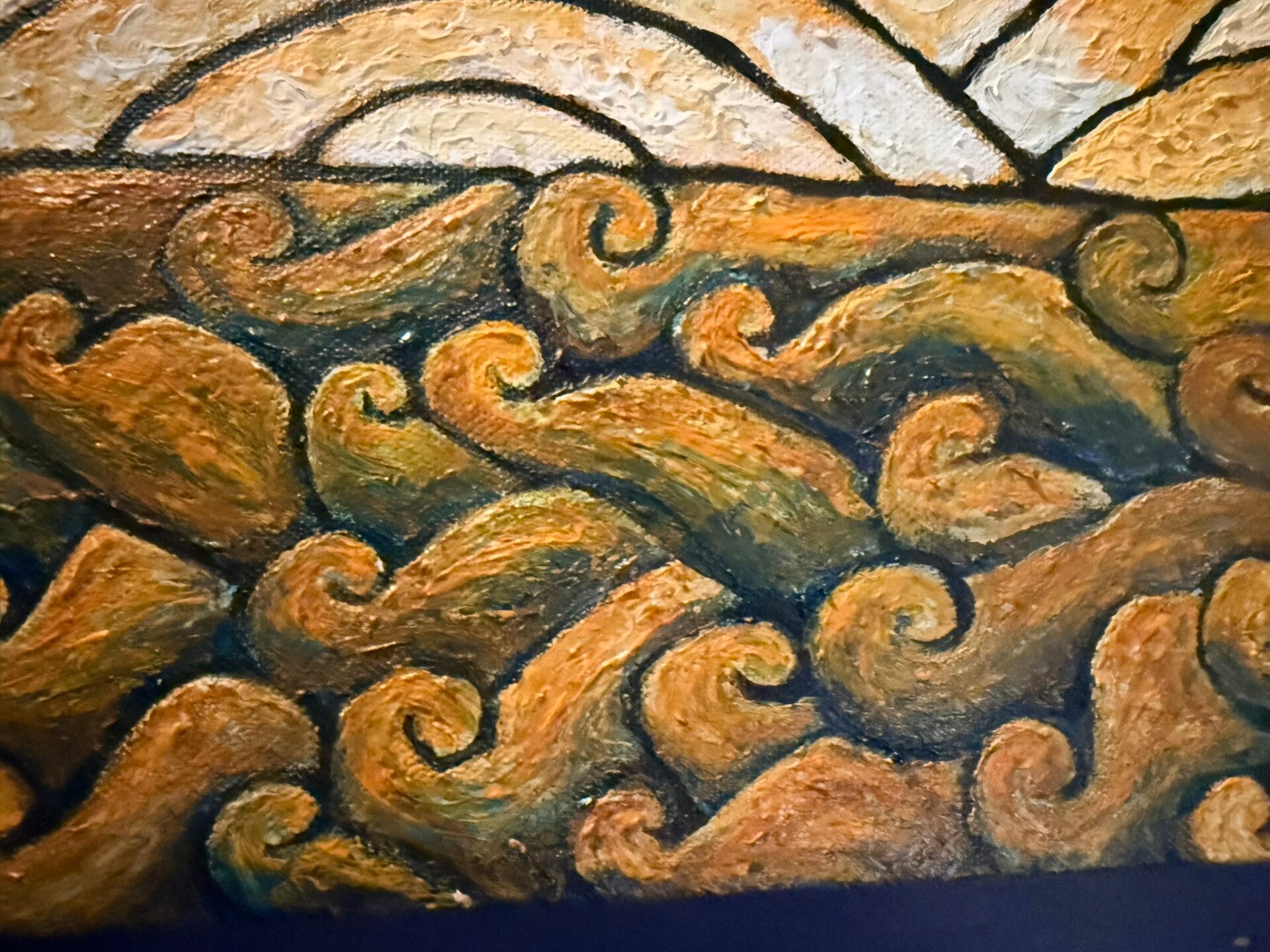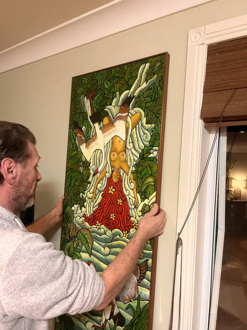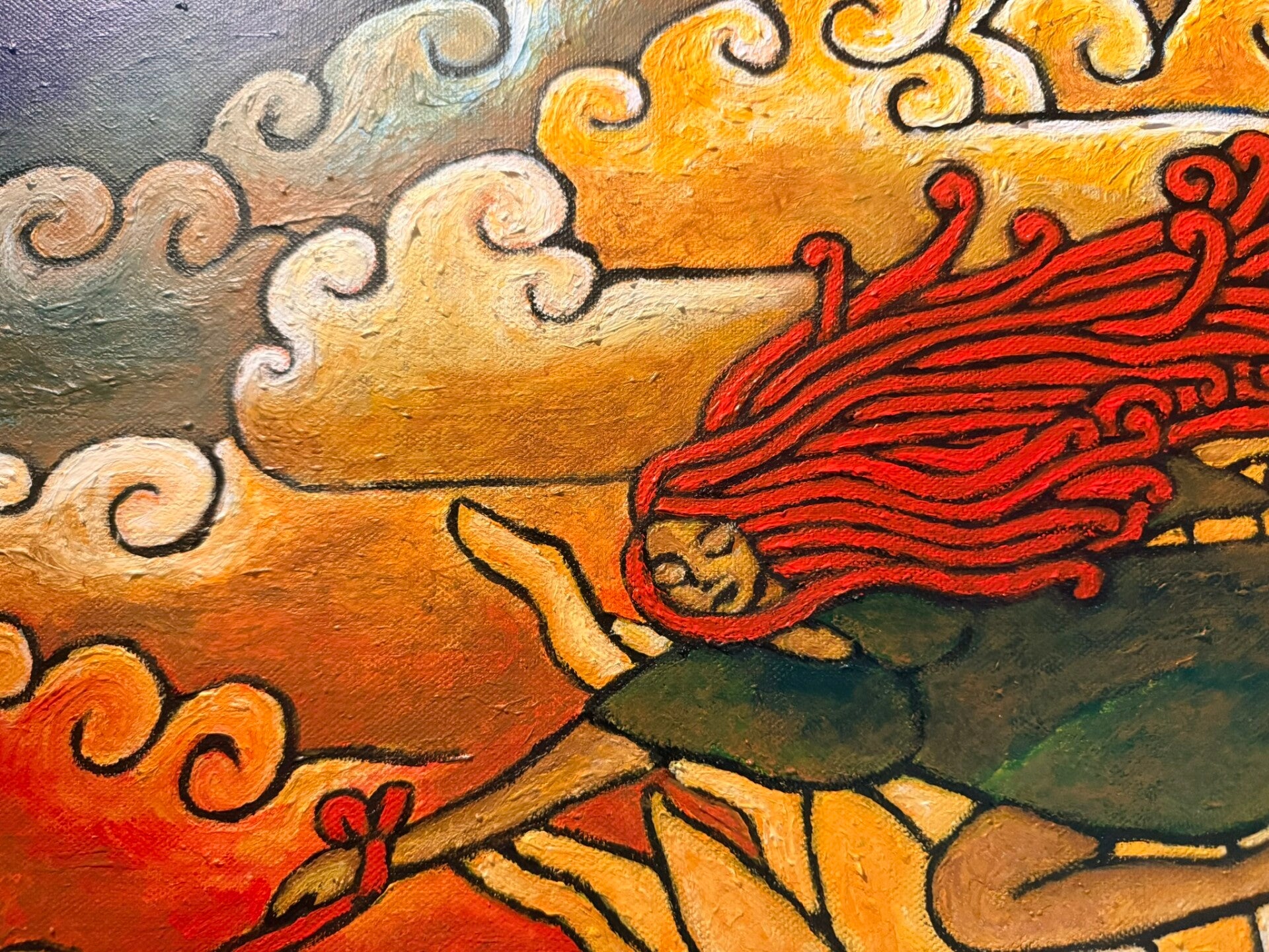 "Lady over waterfall" is a beautiful symbiosis of visual art, folk motifs, poetry, and deep emotional reflections. Tiny parallel brush strokes make this painting look like a richly-colored tapestry, especially given the large scale of the canvas. And the symbolism and raw openness brings parallels to Frida Kahlo, who was one of the first female artists to bravely reflect on personal physical and emotional traumas. Very impressive artwork!